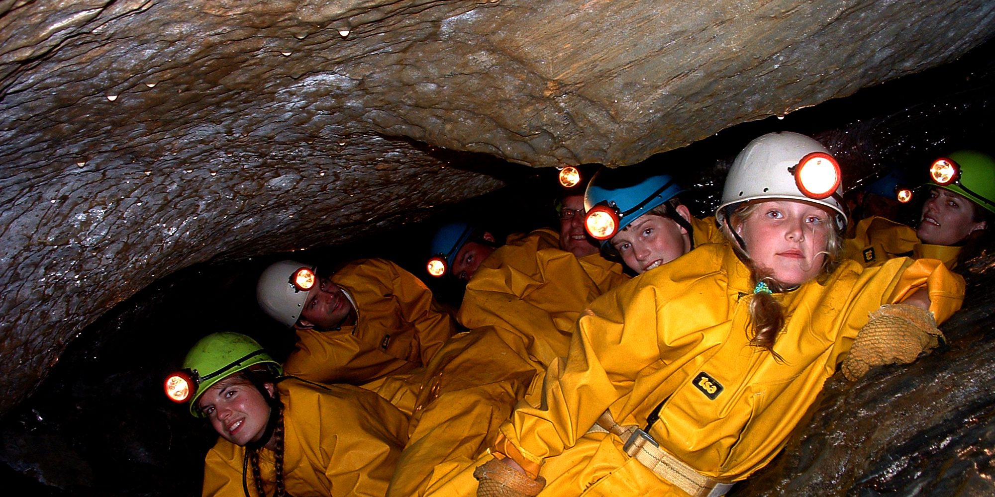 På Mokk Gård kan du kjenne adrenalinet pumpe og utfordre deg selv der du vekselvis klyver og klatrer i de underjordiske kalksteinsgrottene iført våtdrakt og hodelykt.