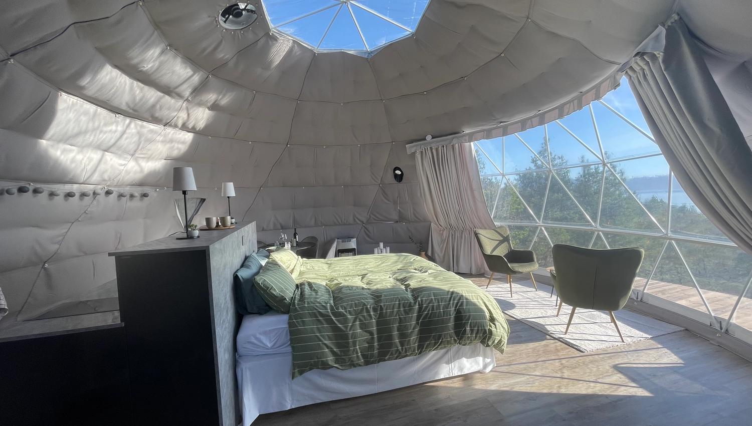 Den 38 m2 store domen har Kvik-kjøkken med kjøleskap og koketopp, spisebord med 4 stoler og en stor dobbeltseng midt i rommet. Fra de to store godstolene foran vinduet kan dere nyte den flotte fjordutsikten.