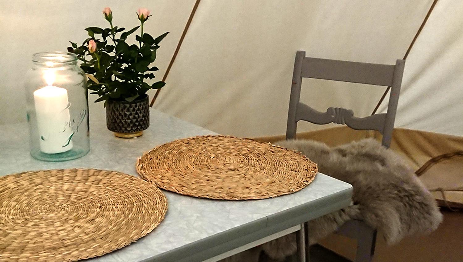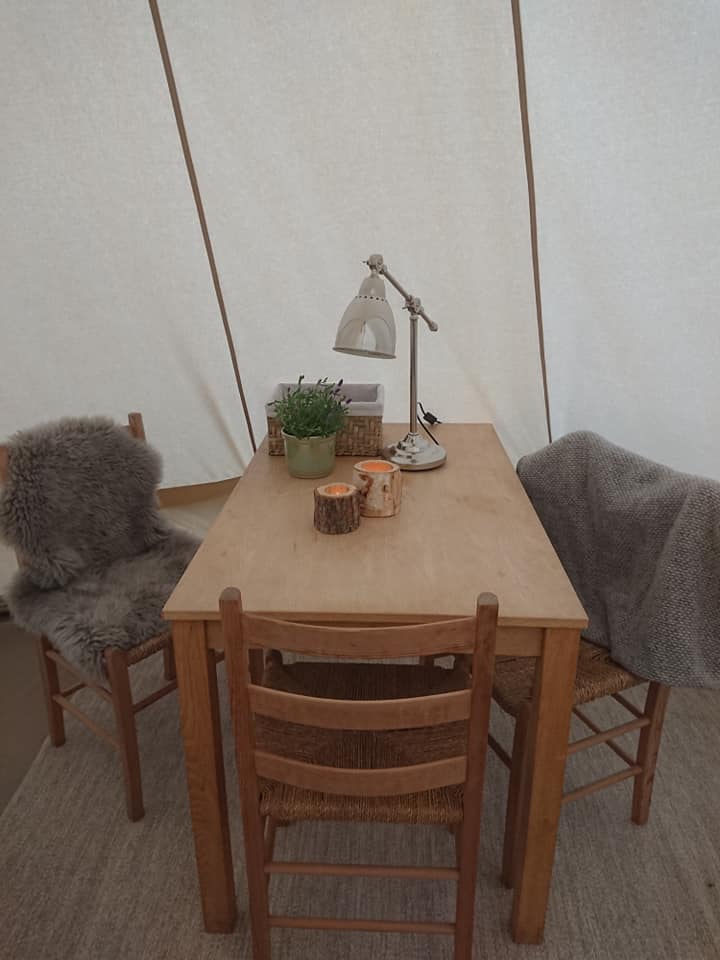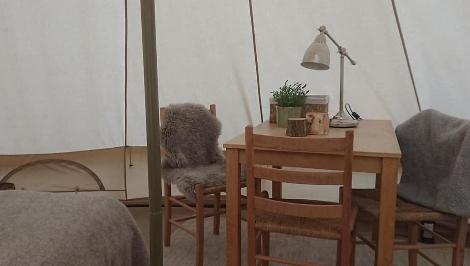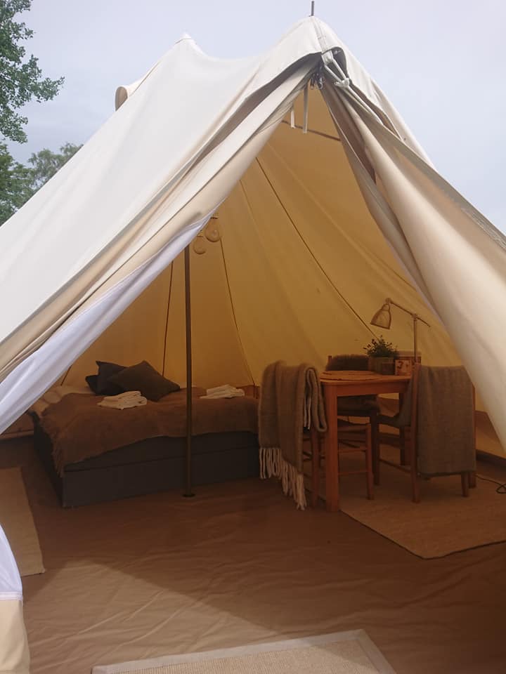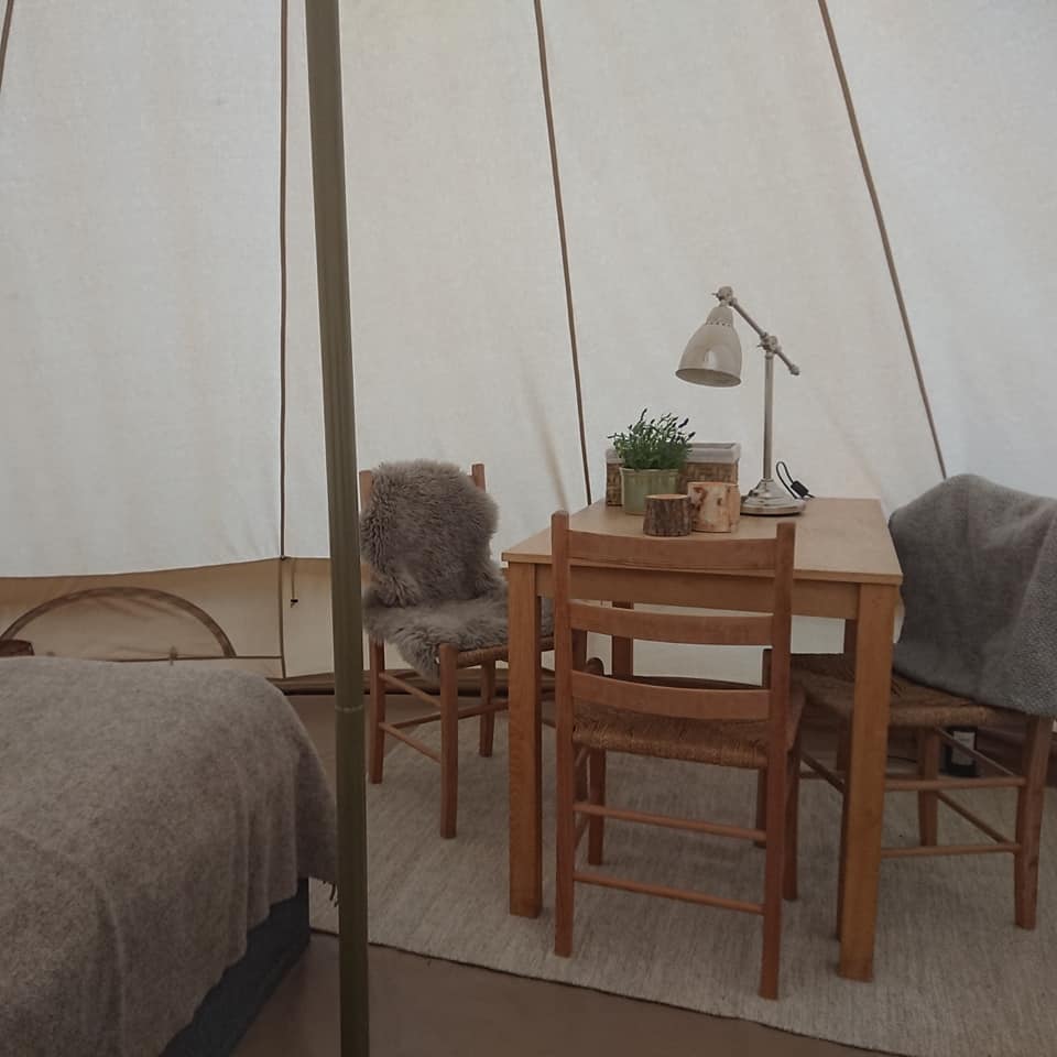 Du får komfort som i et vanlig somverom, med en ferdig opprett dobbeltseng, bord med 2 stoler, innlagt strøm, varmeovn og belysning og wc bak teltet. Det er mulighet for å sette inn en barneseng i tillegg, så en familie kan overnatte her.