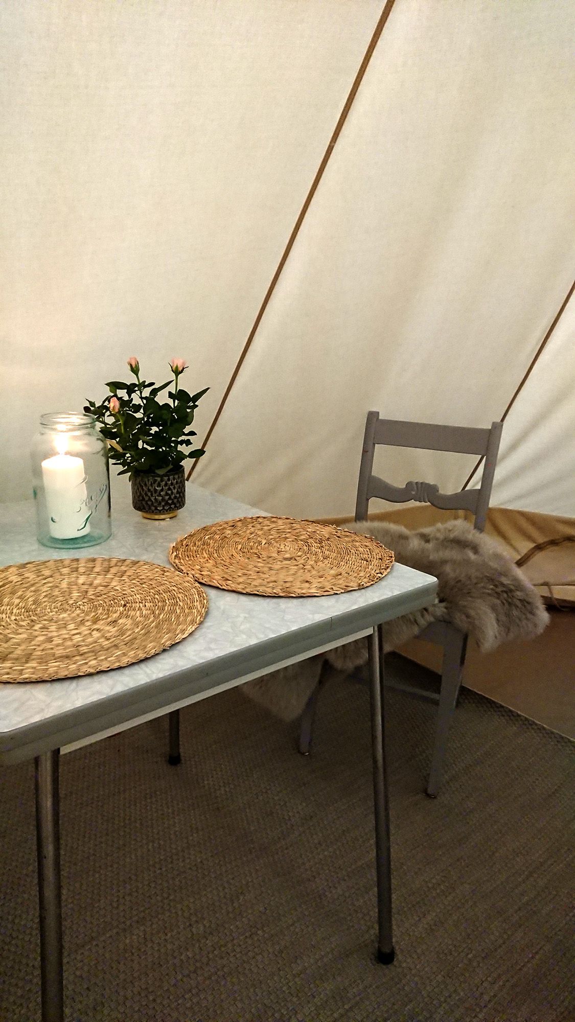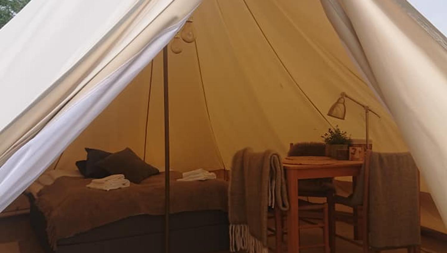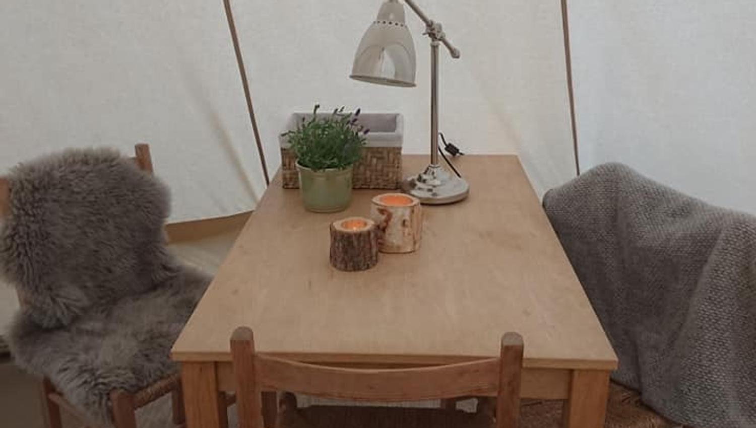 Du får komfort som i et vanlig somverom, med en ferdig opprett dobbeltseng, bord med 2 stoler, innlagt strøm, varmeovn og belysning og wc bak teltet. Det er mulighet for å sette inn en barneseng i tillegg, så en familie kan overnatte her.