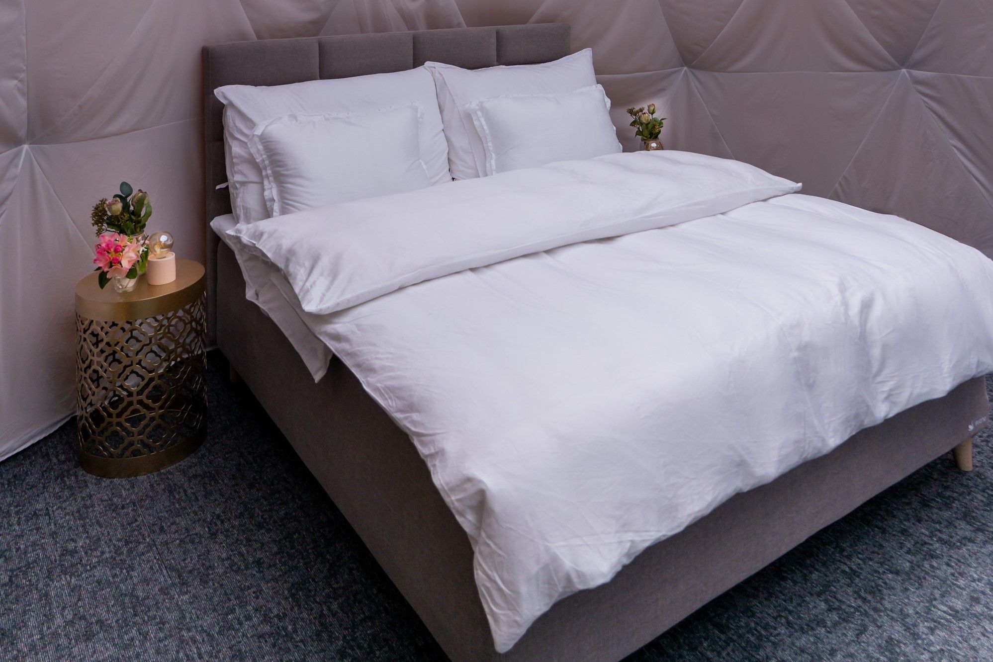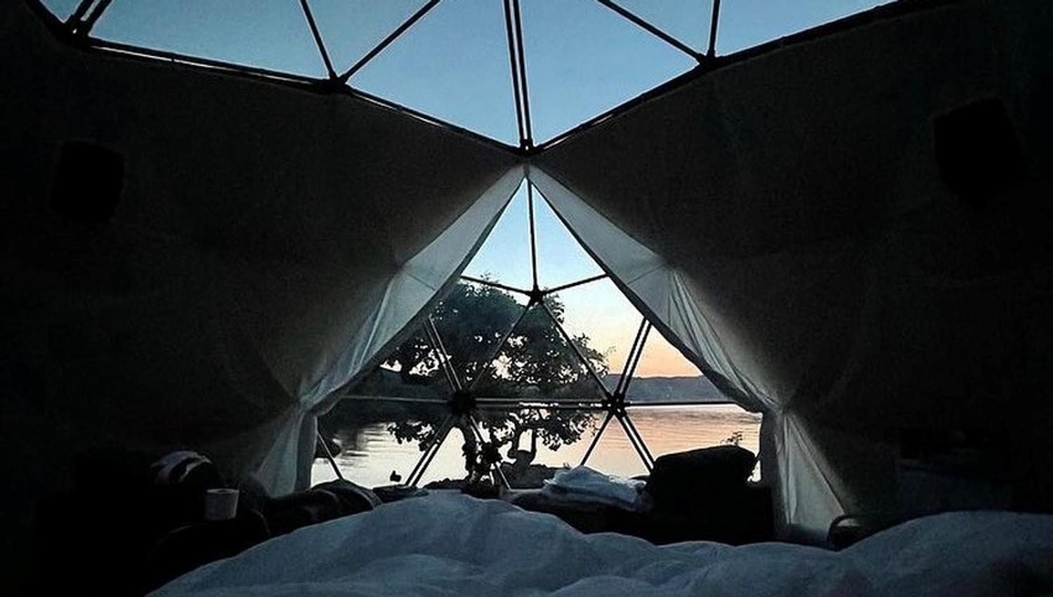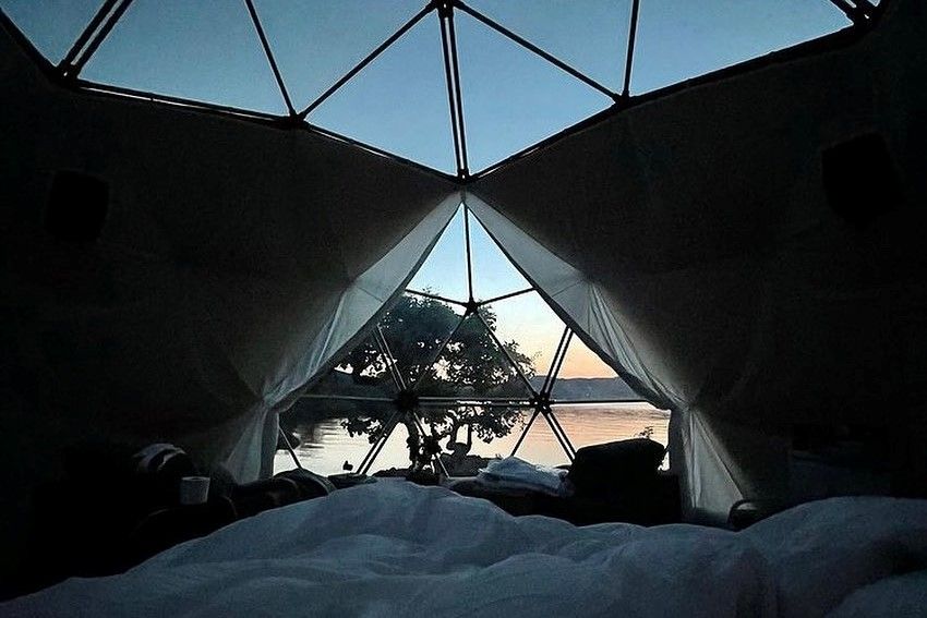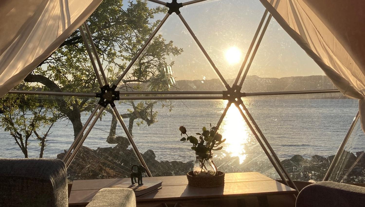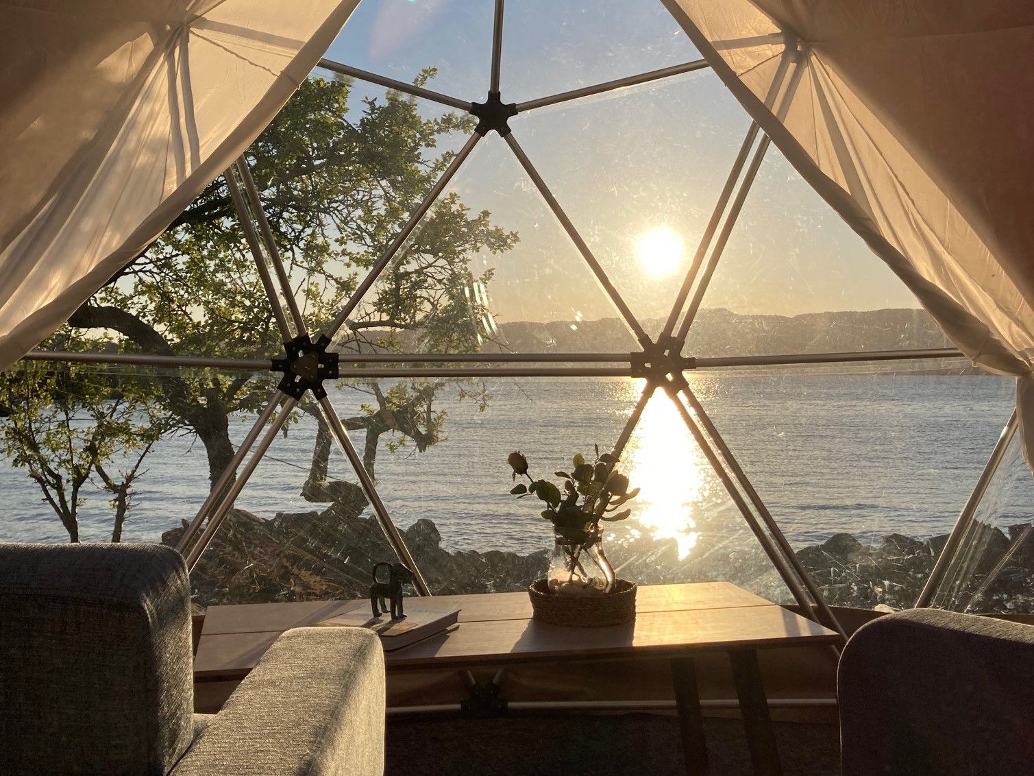 Luksusteltet, den såkalte «domen», er satt opp ved den fineste sandstranden på gården. Her kan du våkne til bølgeskvulp og ta deg et forfriskende morgenbad – før du nyter kaffen i morgensolen.