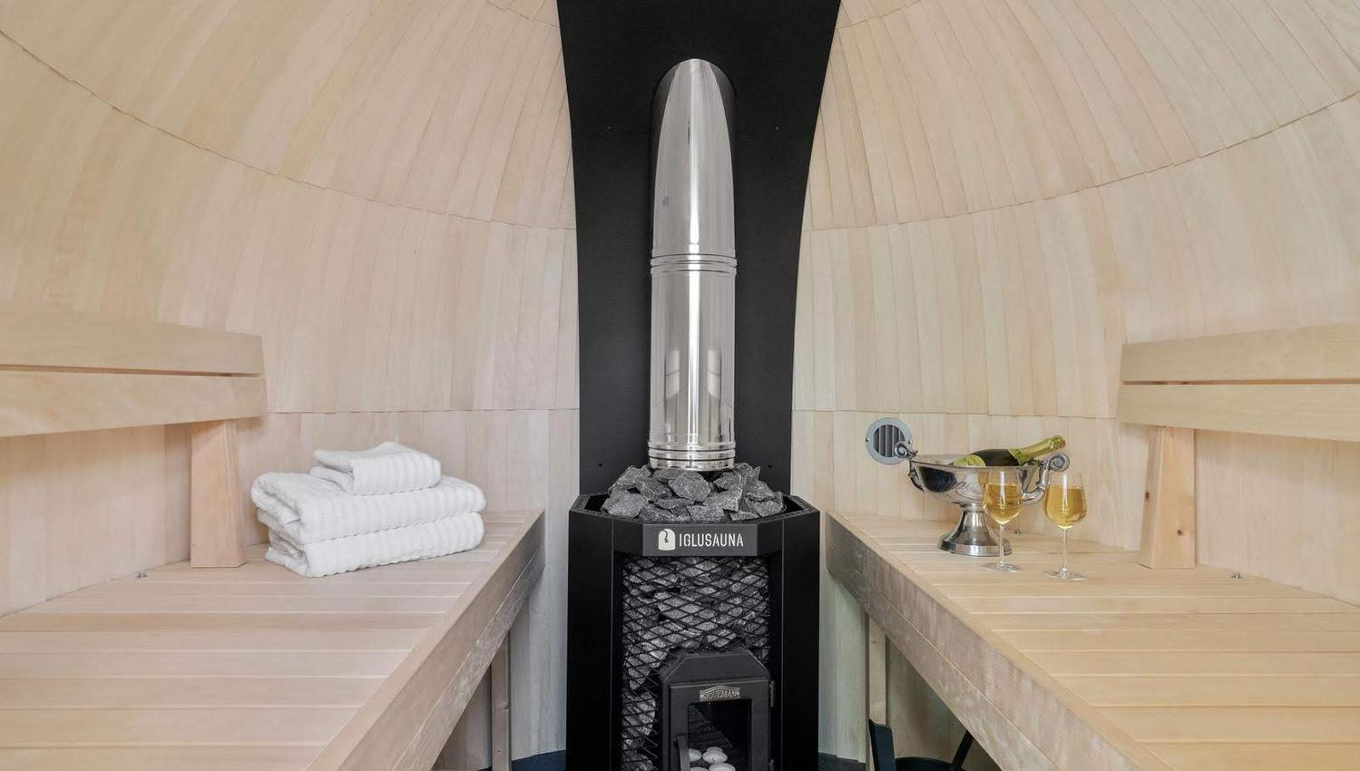 Hyttene har alle fasiliteter som kjøkken, bad/WC, wifi, TV og til og med privat Konglebadstue.
