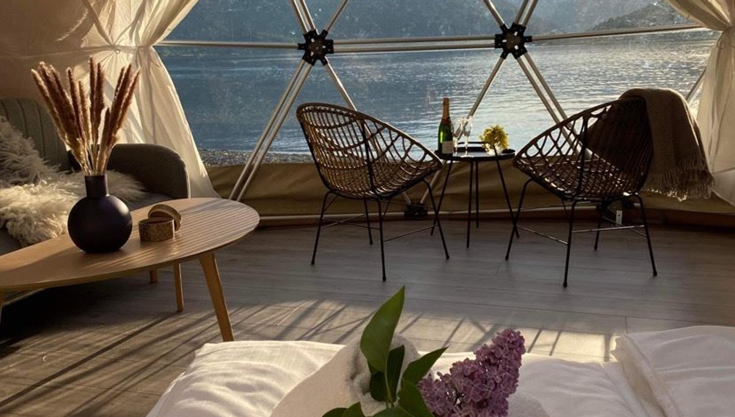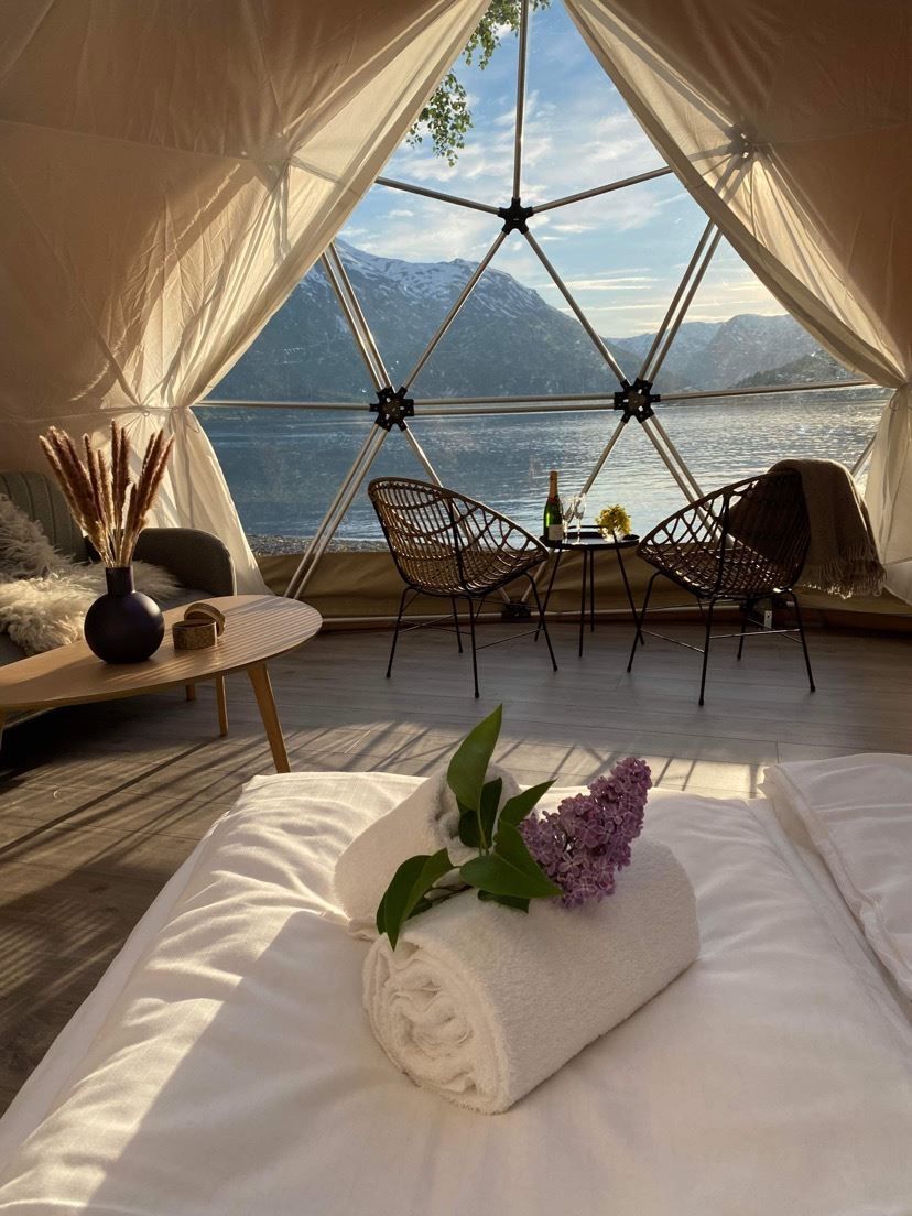 Prøv glamping i strandkanten ved idylliske Oppstrynsvatnet på Vollsnes.