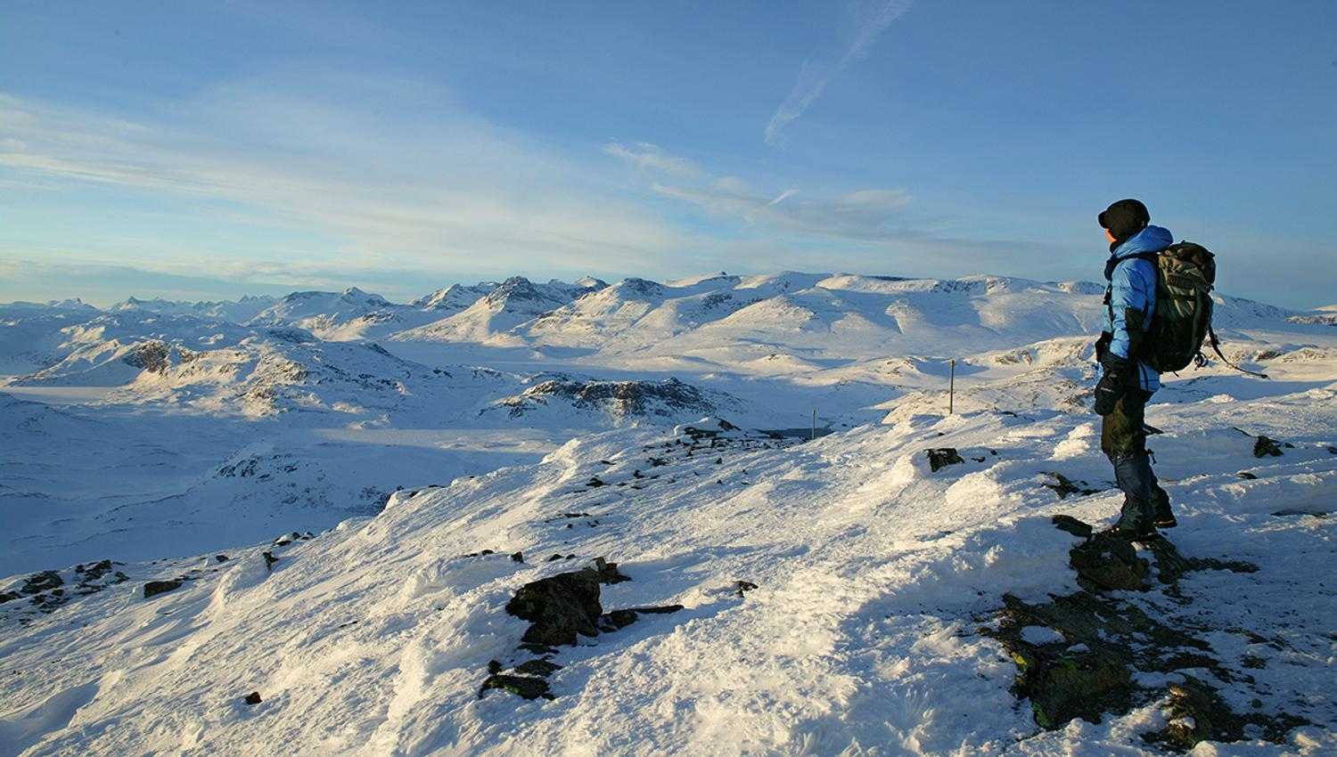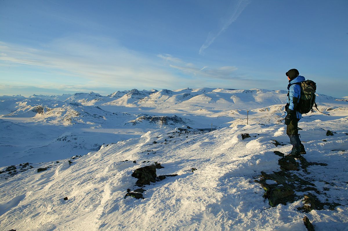 Standard fjellutstyr: gode tursko, vindtett jakke og lue.