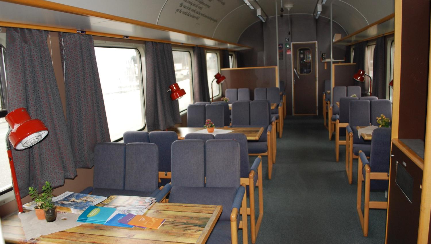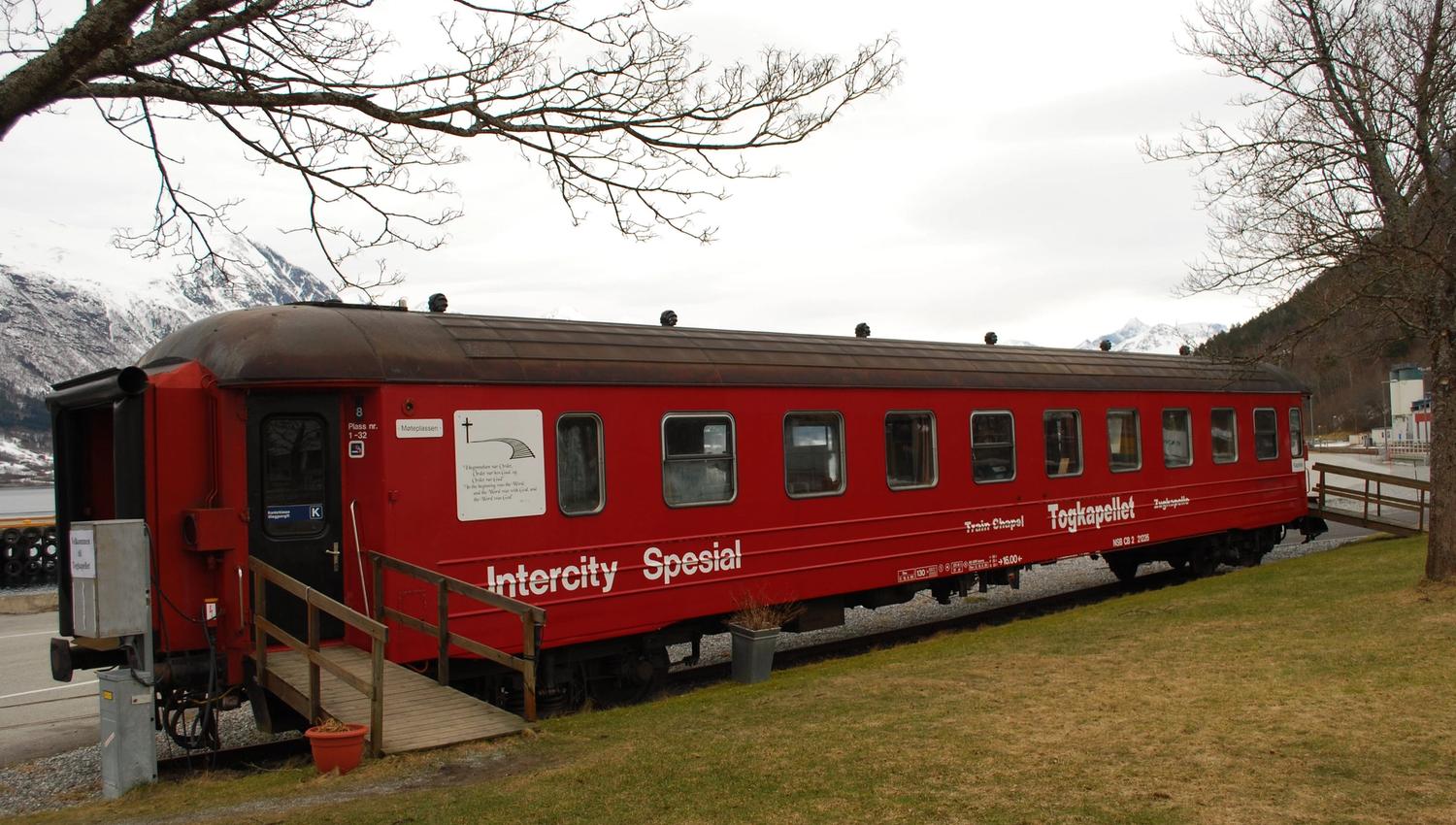 "Kirken på sporet". Velkommen til Norges første og eneste togkapell - sannsynlig også verdens eneste - som har stoppet ved perrongen på Raumabanens endestasjon, Åndalsnes.